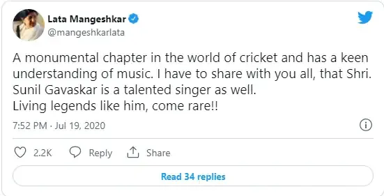 हर साल सुनील गावस्कर (Sunil Gavaskar) 10 जुलाई को अपना जन्मदिन मनाते है. जिन्हें दुनियाभर से इस मौके पर बधांईयां मिलती है. लेकिन भारत की मशहूर गायिका लता मंगेशकर उस दिन सुनील गावस्कर जन्मदिन विश करना भूल गई. जिसके बाद उन्होंने 19 जुलाई 2022 को 7 बजकर 52 मिनट पर एक ट्विट किया. जोकि भारती. खिलाड़ी सुनिल गावस्कर के नाम था. उन्होंने अपने ट्विट में लिखा कि