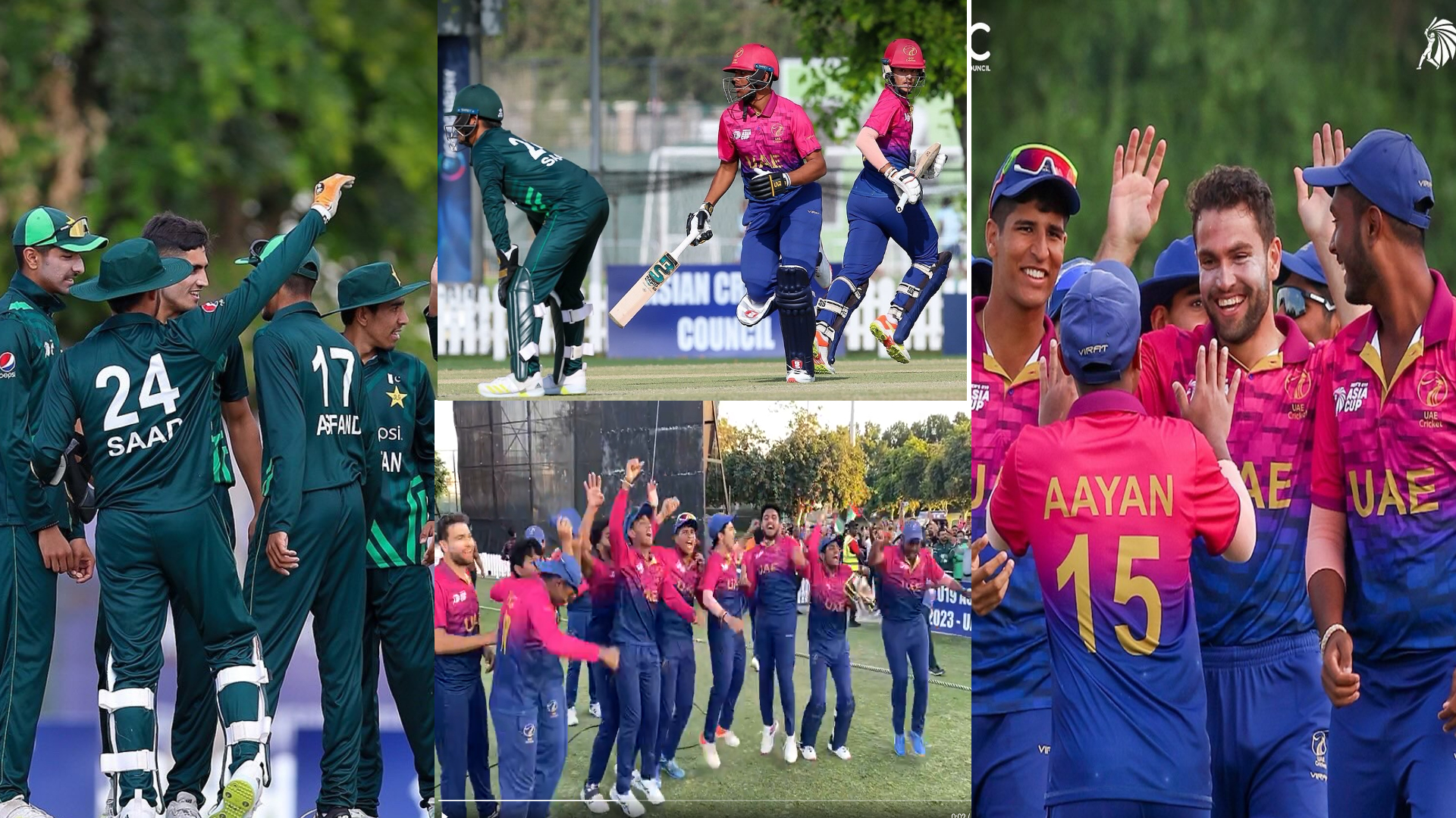 अंडर-19 एशिया कप 2023 का पहला सेमीफाइल मुकाबला शुक्रवार को पाकिस्तान अंडर-19 और यूएई के बीच खेला गया. UAE की टीम पहले बल्लेबाजी करते हुए पूरे 50 ओवर भी नहीं खेल पाई 47.15 ओवर में 193 रनों पर ही सिमेट गई.वहीं इस लक्ष्य का पीछा करने उतरी पाकिस्तान अंडर-19 की टीम यूएई की घातक गेंदबाजी के सामने 182रनों पर ही ढेर हो गई.